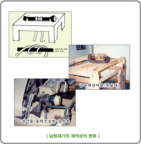 남원제기의 형태는 그것을 만들었던 도구의 발달과 그 흐름을 같이 한다. 제기의 제작에 쓰이는 갈이틀은 각 시대에 따라서 변화되는 양상을 띤다. 초기에는 양손을 이용한 재래식 갈이틀이 사용되었고 이후 족답기라 불리는 발을 이용한 갈이틀이 사용되었다. 1950년대에는 물레방아의 동력을 이용한 갈이틀의 사용에 이어 그 후 전기가 보급됨에 따라 전기를 동력으로 한 금속제 갈이틀이 사용되었다. 이렇게 갈이틀의 형식이 변화하였지만 그 기본원리는 모두 같으며 현재 남원에서도 이러한 갈이틀의 원리를 이용하여 제기를 제작하고 있다.